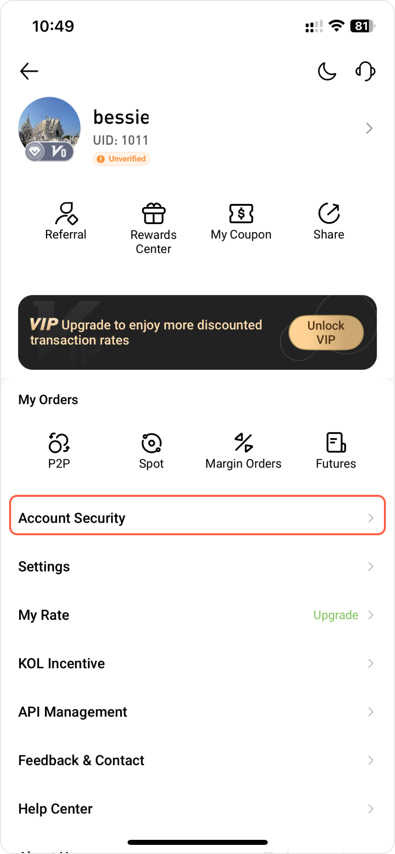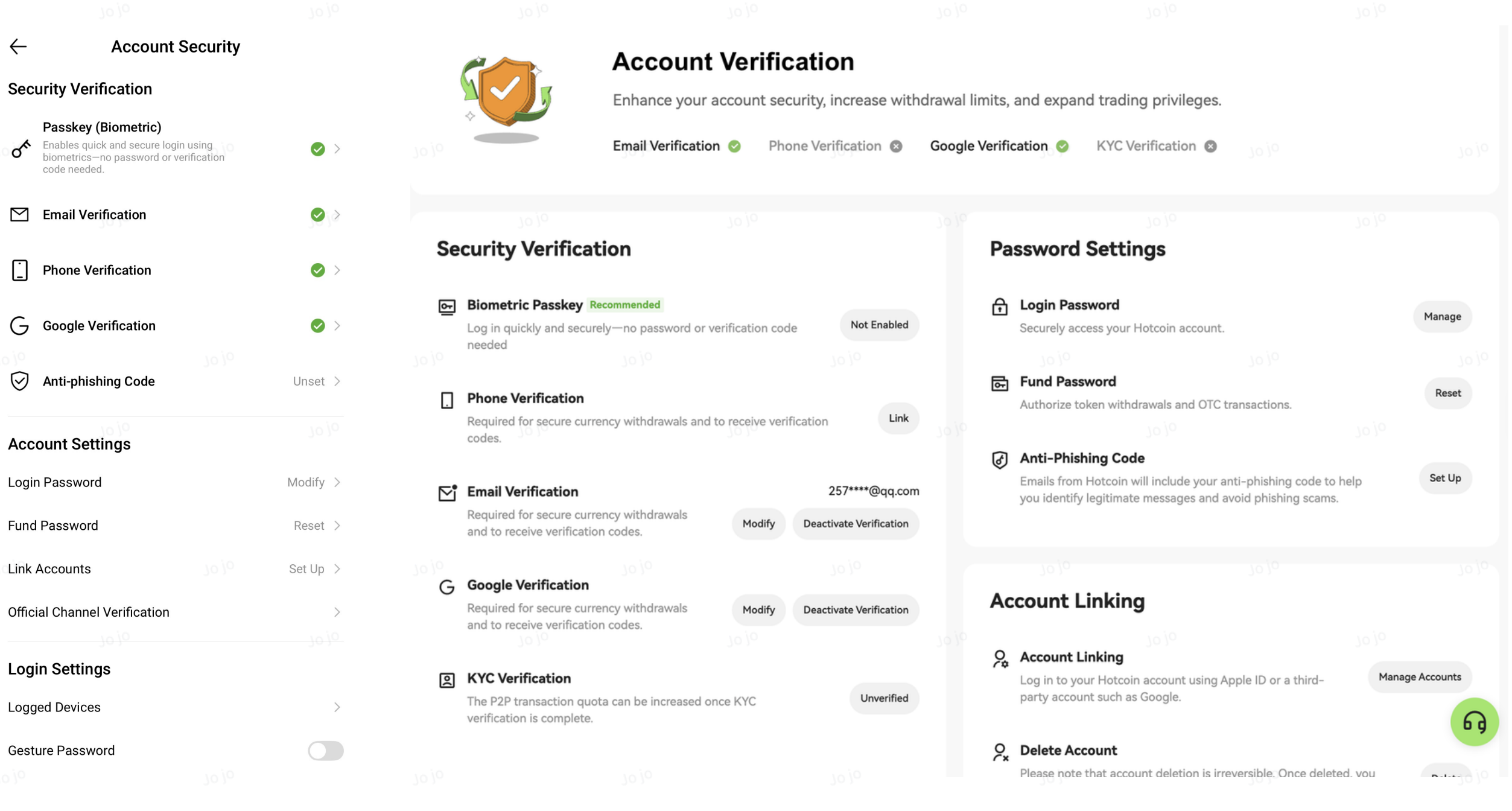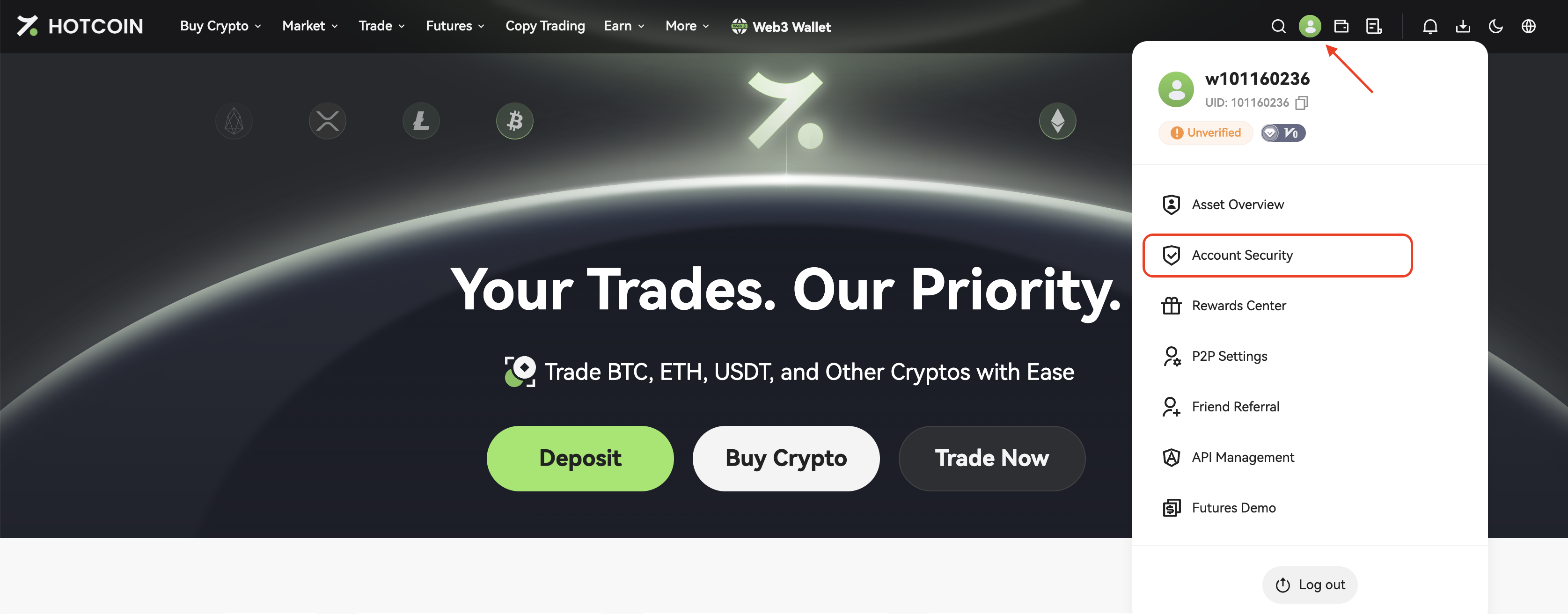 Web: On the Hotcoin website homepage, hover over the profile icon in the top-right corner and select Account Security from the dropdown menu.