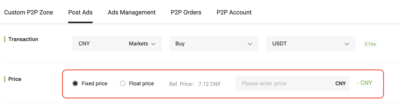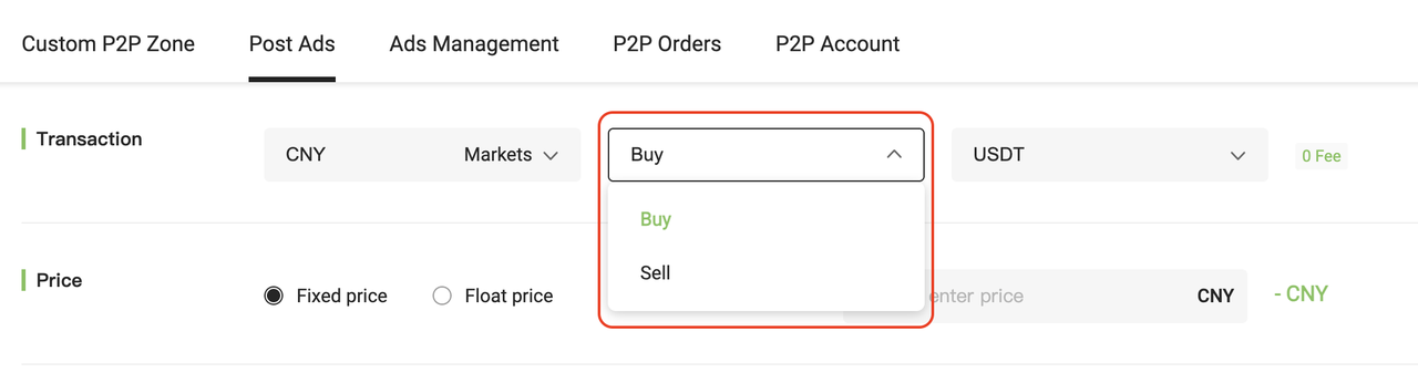 Select whether you want to post a Buy or Sell ad. (P2P trading defaults to CNY.)