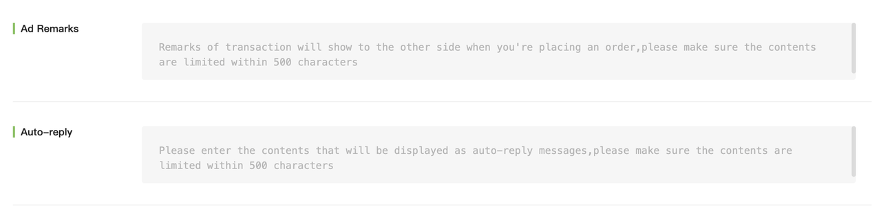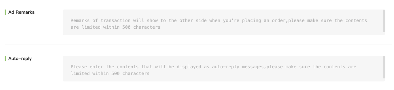 Scroll down to configure the Auto-Reply Message (sent automatically after an order is placed) and Ad Remarks (displayed when users view your ad).