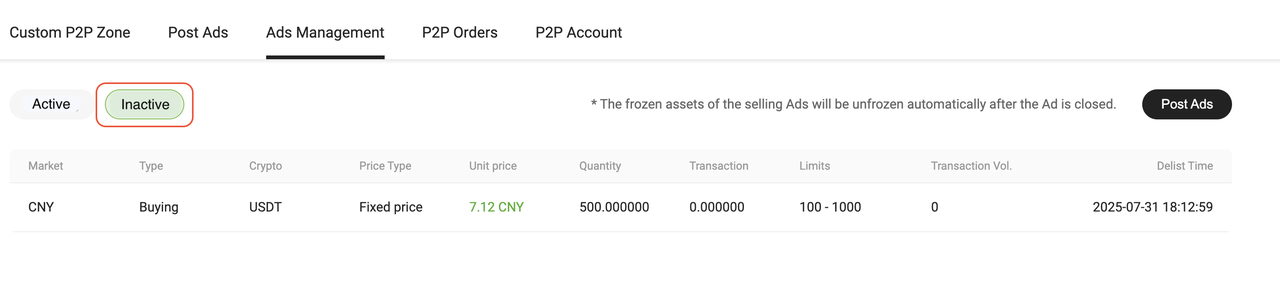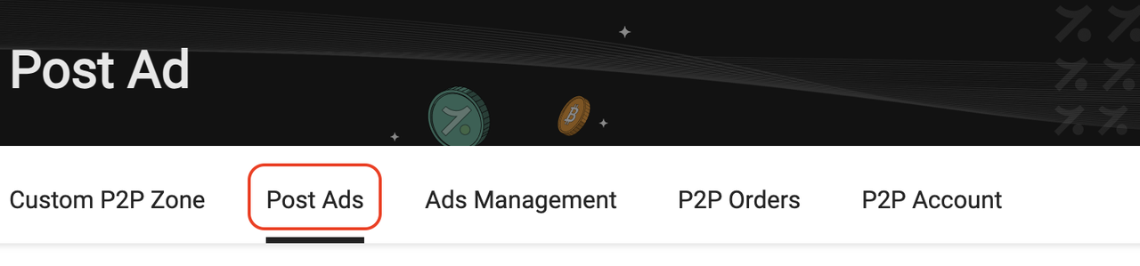 1. Go to the P2P Merchant section then click the 「Post Ads」 button