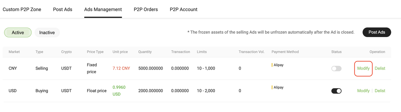 For active ads, disable the「Status」 toggle and click the「Modify」 button to edit the ad. You will be redirected to the ad editing page.