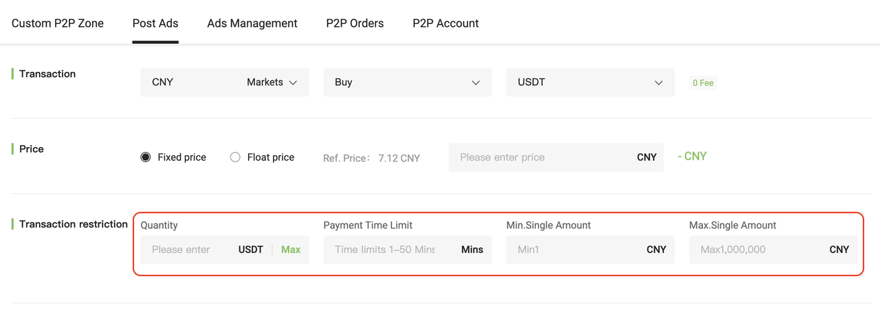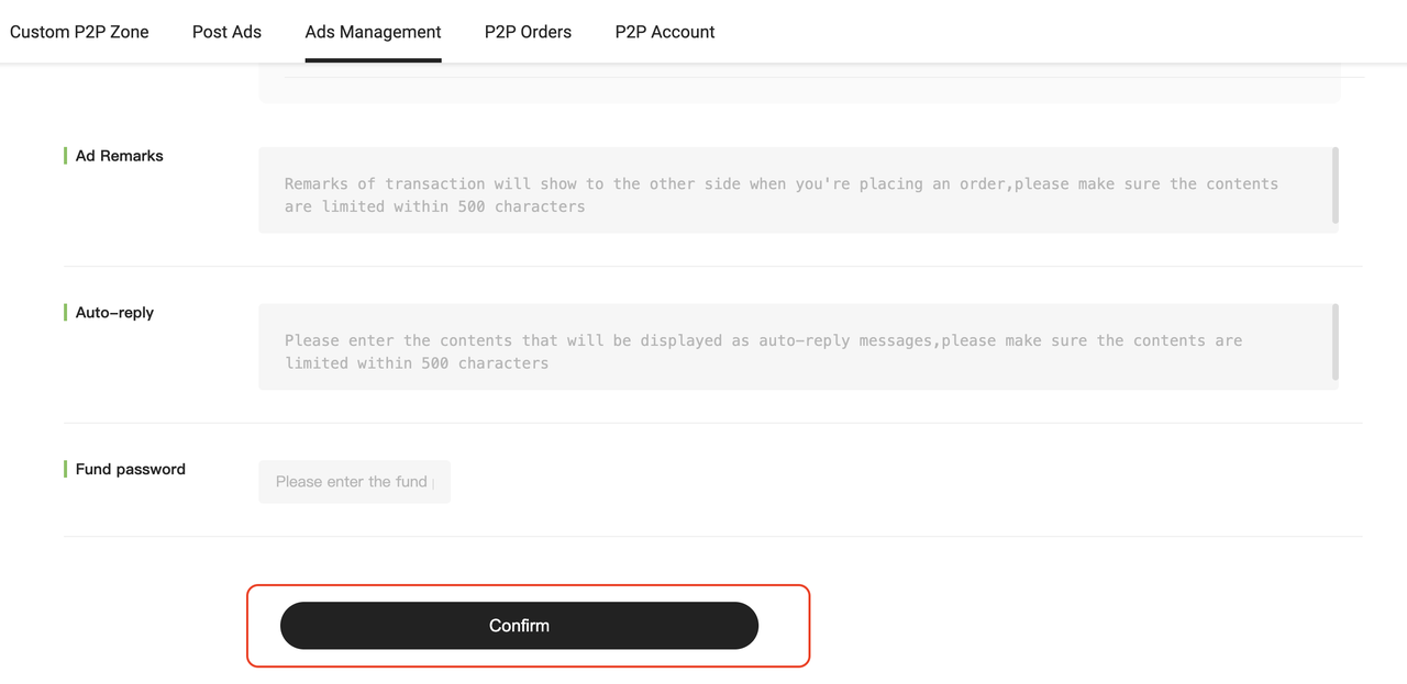 After setting all parameters, enter your fund password and click 「Confirm」 to post your ad.